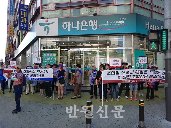 가칭 ‘안산중앙주공2단지 바른재건축 사랑방모임’은 25일~27일까지 중앙동 중심상가 일대에서 “해임된 조합장은 하루빨리 물러가라”는 문구가 담긴 현수막 등을 들고 집회를 펼쳤다. 이들이 조합장을 상대로 발끈하는 이유는 간단히 아파트 단지 내 상가문제 때문이다.