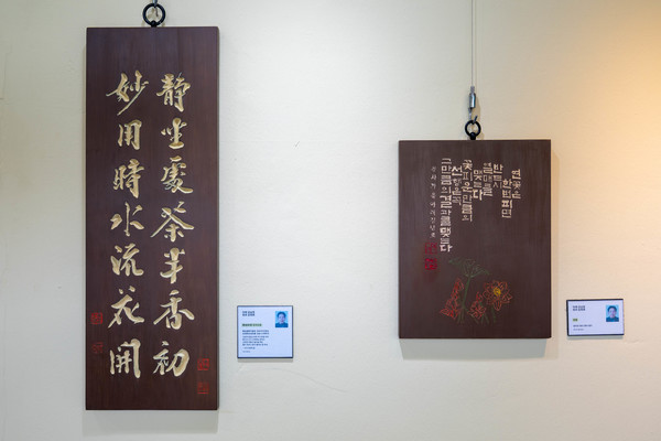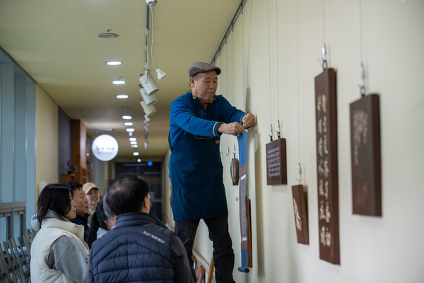전시를 앞둔 작업실은 늘 활기가 넘쳤다. 수강생들은 나무 위에 한 글자 한 글자를 새기며 조심스레 끌을 움직였고, ‘톡톡’ 울리는 각자의 소리는 공간을 채우며 전통의 손맛을 느끼게 했다. 서로의 작품을 들여다보며 조언을 나누고 웃음이 오가는 모습은 전통각자반만의 온기를 보여준다. 전시 준비 과정에서도 참여자들은 작품의 높낮이와 배치를 하나하나 맞춰가며 완성도를 높였다. 작품을 걸기 위해 사다리를 오르내리며 세심하게 조정하는 모습에서는 함께 만들어가는 전시의 힘이 느껴졌다.